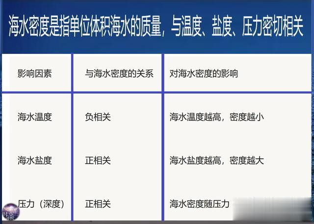 水在不同温度中的密度也不一样,在4摄氏度时,密度最大,约为1g/cm^3,温度高或低于这个温度,密度都会减小。在3000米深海中,水温一般在1~4摄氏度之间,而在海面,分寒带热带不同,水表温度一般在10~30摄氏度之间。