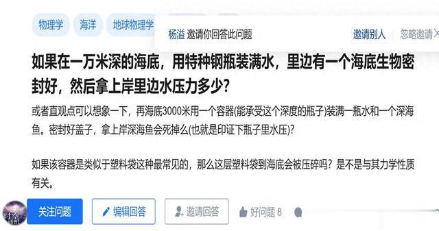 本文基于回答网友邀答问题:如果在一万米深的海底,用特种钢瓶装满水,里边有一个海底生物密封好,然后拿上岸里边水压力多少?(见下面截图)